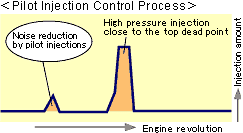 Еще одним преимуществом пилотных впрысков, перед основным является то, что он помогает в снижении вибраций и шума двигателя. При пилотном впрыске равномерно увеличивается температура камеры сгорания и позволяет избежать образования одномоментного возгорания смеси, которая приводит к появлению характерного стучания дизельных двигателей, и тем самым, снижается уровень шума двигателя.