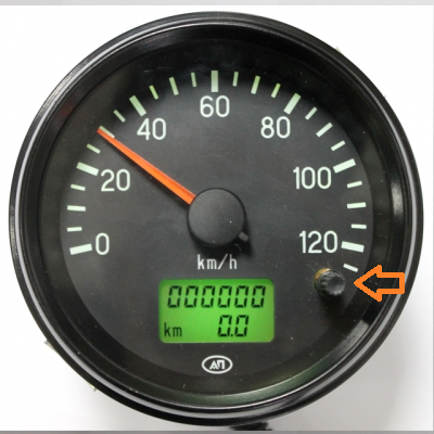 Но чтобы приступить к настройке прибора нужно ввести код, который открывает доступ к настройкам корректировки пробега. Для этого, необходимо нажать кнопку помеченную стрелкой на фото и удерживать в течении не менее 3-х секунд. Затем, поворотом этой же кнопки переключить режим управления на установку кода.