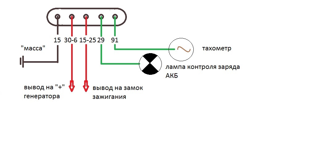 Что касается подключения генератора, то как видно на рисунке один из контактов подключен к «массе», на втором «плюс» подключен непосредственно от АКБ, на третьем питание появляется при включенном зажигании. Четвертый вывод предназначен для контрольной лампы заряда АКБ, а пятый соединен со вводом на тахометр.
