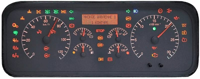 Итак, электронная панель приборов «Элара» 69.3801… Надо заметить, что на автомобилях КамАЗ иногда устанавливается также панель приборов «Аметек», разработанная американской компанией для татарского автогиганта. И с ней, тоже можно проделать «фокус» который я предлагаю, но расскажу на примере данной модели. Вот так выглядит спереди панель «Элара» на современных автомобилях КамАЗ