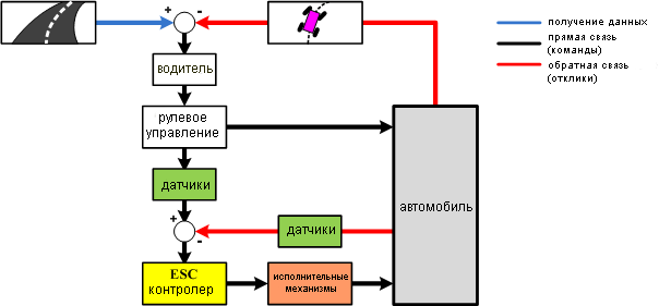 На рисунке выше показана архитектура типичной системы контроля устойчивости, включающая три основных элемента: водитель, транспортное средство и окружающая среда. Система ESC использует угол поворота и скорость автомобиля для расчета предполагаемой траектории пути транспортного средства. Используя датчик скорости рыскания в сочетании с датчиком поперечного ускорения, система вычисляет фактический путь транспортного средства. В нормальном контуре управления водитель обнаруживает отклонение транспортного средства от текущей дорожной траектории и исправляет его через систему рулевого управления. Когда возникает вероятность потери контроля над транспортным средством водителем, электронная система контроля устойчивости определяет отклонение между предполагаемым путем движения транспортного средства и фактическим путем движения транспортного средства. Система ESC генерирует необходимый момент рыскания, автоматически активируя тормозное усилие на нужном колесе, чтобы вернуть транспортное средство к намеченной траектории.