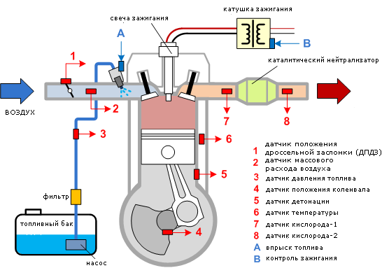 Модули управления двигателем получают данные от самых разных аналоговых датчиков, оцифровывают эту информацию и используют ее для расчета правильных настроек двигателя. Результаты этих расчетов преобразуются и использются для управления исполнительными механизмами. На приведенной ниже диаграмме показаны некоторые из основных датчиков и исполнительных механизмов, контролируемых модулем управления двигателем.