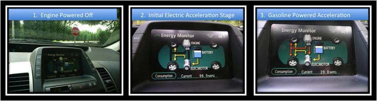 На приведенном ниже рисунке показано, как система работает на полностью гибридном Toyota Toyota Prius. Когда автомобиль полностью останавливается, двигатель выключается. Обратите внимание, что компьютер мониторинга энергии не показывает её направление потока. Когда педаль тормоза отпускается, электрическая энергия от батареи используется для запуска двигателя и для поддержки начального ускорения. Желтые стрелки показывают поток энергии от батареи к электродвигателю, который обеспечивает начальный разгон. Когда требуется мощность двигателя внутреннего сгорания, он быстро запускается и помогает электрическому двигателю в движении автомобиля.