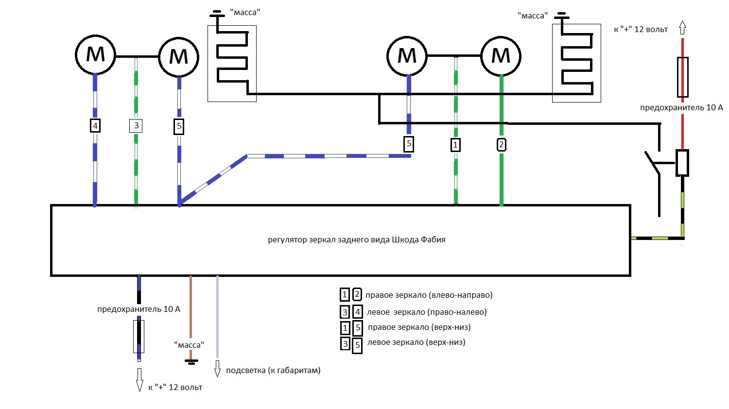 Если вы воспользуетесь моей схемой, то вы сможете установить регулировку и подогрев зеркал практически на любой автомобиль, потому что это стандартный вариант, который используется на подавляющем большинстве транспортных средств. Надеюсь, на рисунке всё понятно, но ещё могу добавить, что здесь использовался переключатель-регулятор от Шкода Фабиа. Поэтому цвета проводов указаны для него. Электродвигатели обозначены буквой «М», нагревательные элементы в виде «змейки». Подогрев зеркал надо подключать через реле, которое управляется «массой». Если еще что-то будет непонятно, звоните по телефону указанному на странице «услуги и контакты».