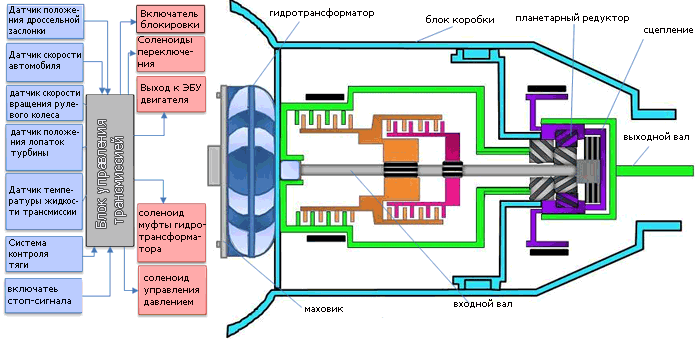 Электронные датчики контролируют выбор положения передачи, скорости автомобиля, положения дроссельной заслонки и ряда других параметров. Основываясь на этой информации, модуль управления регулирует ток, подаваемый на соленоиды в коробке передач, которые контролируют положение различных клапанов и шестерен.
