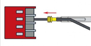 - Вставить очищенные от изоляции концыпровода с обеих сторон в обжимной соединитель соответствующего размера/цвета и обжать соединитель с обеих сторон, используя соответствующую канавку обжимных клещей (см. цветовую маркировку). Изоляция обоих концов проводов не должна при этом заходитьв проводящую часть соединителя (и не должна быть обжата вместе с жилой провода). С другой стороны свободные концы изоляции должны оставаться внутри соединителя (не выходить из него).