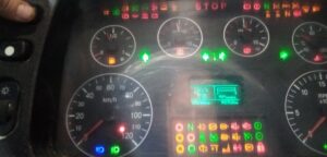 Если одновременно перестали работать указатели даления воздуха, указатель уровня топлива в баке и спидометр панели приборов ЩП 8099 на автомобиле МАЗ «КОЛОС», то первое, что нужно сделать это проверить функцию самодиагностики. Для этого, нужно кратковременно нажать на левую верхнюю кнопку возле щитка приборов и, как видно на фото должны загореться все индикаторы на панели.