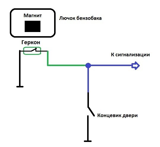 2) Датчик открытия лючка бензобака (схема 2). Для отпугивания воришек бензина можно установить геркон с нормально замкнутым контактом на лючок бензобака и подключить его к концевому выключателю двери. Магнит приклеить на лючок, а геркон зафиксировать внутри лючка, напротив магнита так, чтобы при открывании контакты замыкались и срабатывала противоугонная сигнализация.