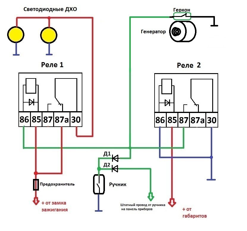 3) Для включения реле после запуска генератора (например реле включения дневных ходовых огней, схема 3). После запуска двигателя в обмотках генератора возникает магнитное поле, благодаря которому корпус генератора магнитит и если на нём разместить геркон, то он должен сработать (место на корпусе выбирается опытным путём). Таким образом здесь геркон будет управлять реле после запуска двигателя.