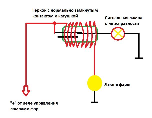4) Контроль исправности ламп ( схема 4). Если на геркон намотать медный изолированный провод в виде катушки и пустить по нему определённый ток, то в катушке возникнет магнитное поле, которое разомкнёт нормально замкнутый контакт в герконе. В данном виде получается «герконовое» реле с нормально замкнутым контактом. Это явление можно использовать например для контроля исправности ламп фар. Количество витков и сечение провода подбирается опытным путём. При исправности лампы катушка размыкает реле и сигнальная лампа не горит. Можно использовать нормально разомкнутое реле, но тогда сигнальная лампа будет указывать уже на исправность ламы в фаре.