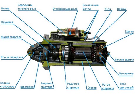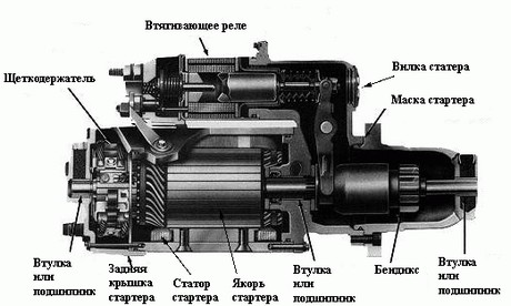 По принципу работы стартеры схожи с электрическими двигателями, но, по конструкции несколько отличаются, в первую очередь тем, что имеют специальный механизм, так называемую муфту свободного хода, или бендикс.
