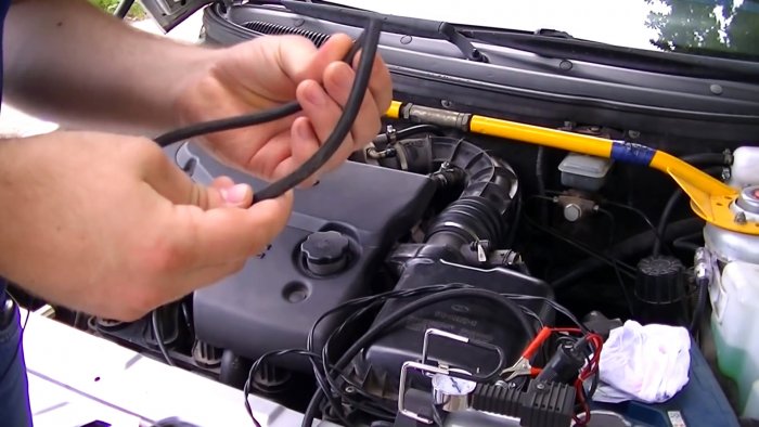 Затем нужно закачать воздух во впускной коллектор, через любой штуцер предварительно сняв с него шланг. Воздух закачивается в ресивер до тех пор, пока патрубок от фильтра не раздуется в области гофры до упругости мяча. После выключения компрессора нужно послушать, нет ли шипения.