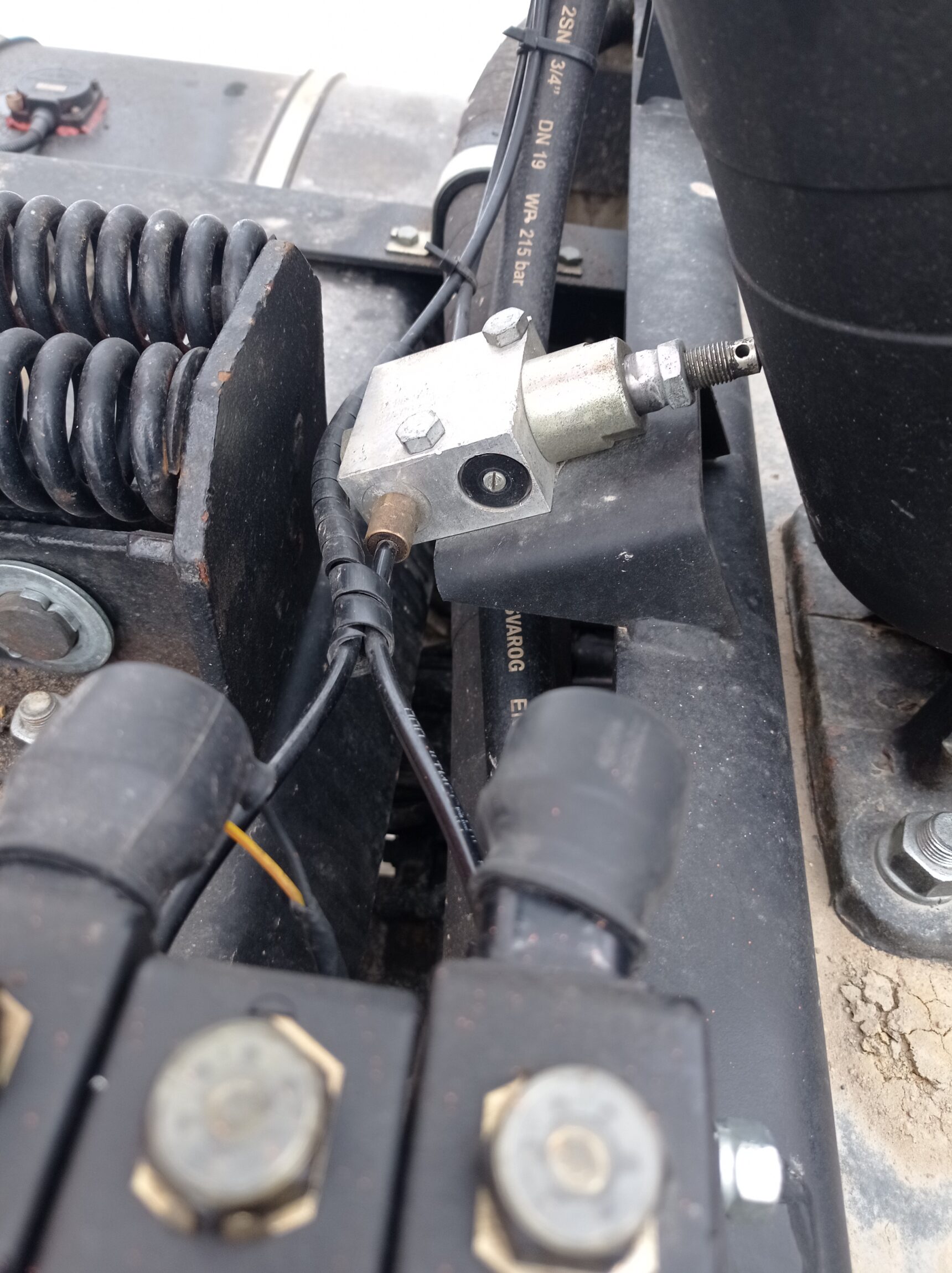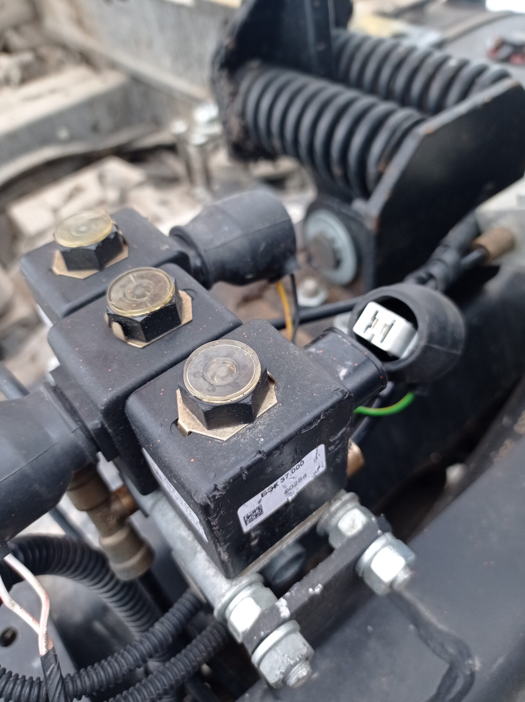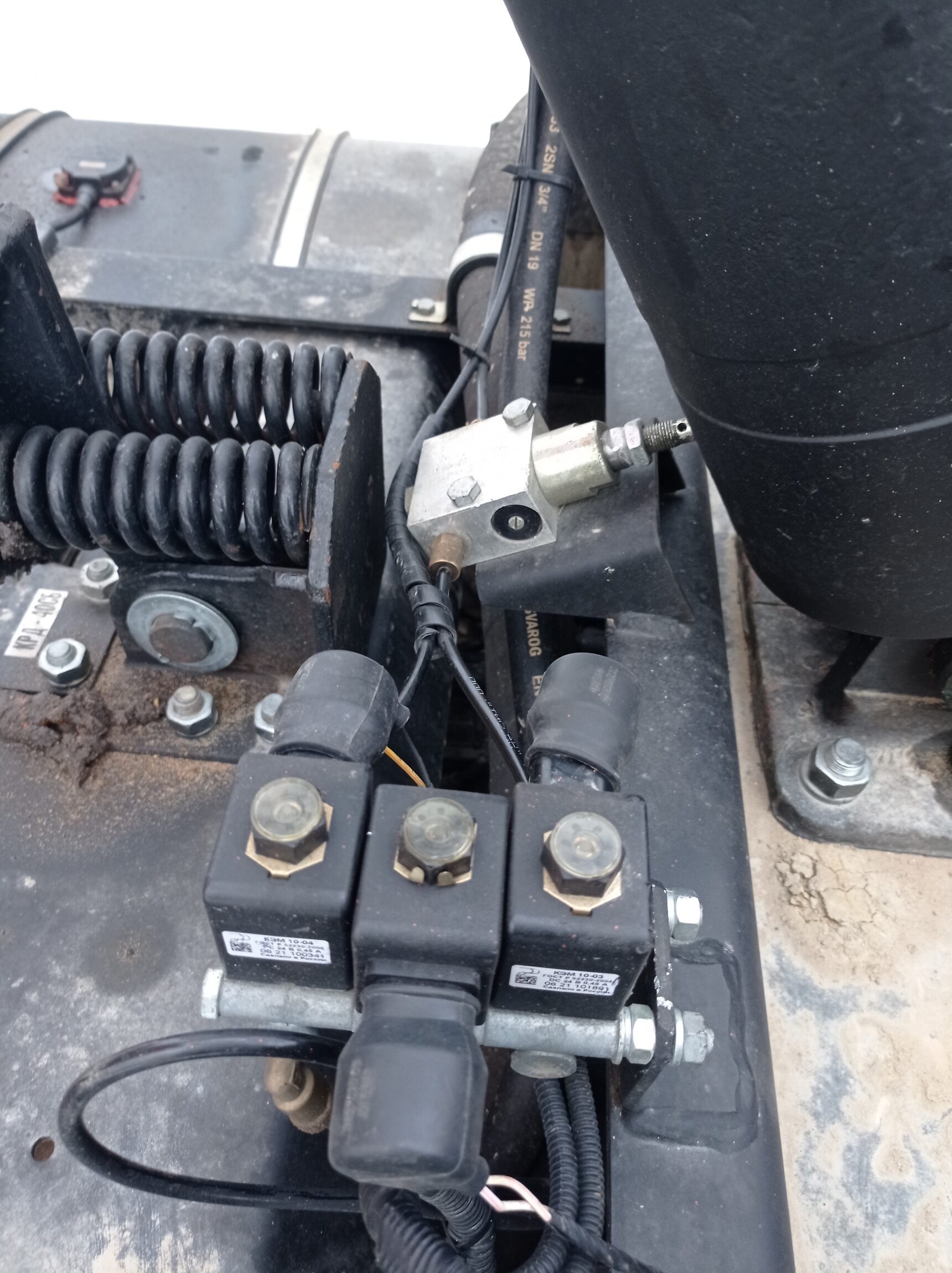 При условии включенной коробки отбора мощности, подаётся питание на клавишу управления подъемом и опусканием кузова и основной пневмоклапан. Проверить её исправность нетрудно обычным мультиметром. Но как правило, я сразу проверяю напряжение на клапане подъёма кузова. На фото этот клапан — крайний правый. Средний — это основной пневмоклапан, а слева — клапан опускания кузова.