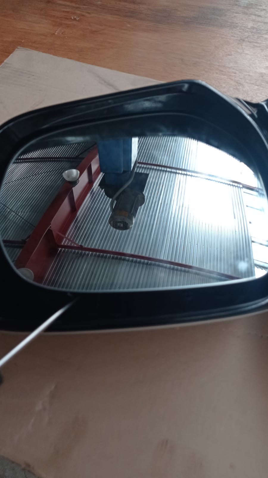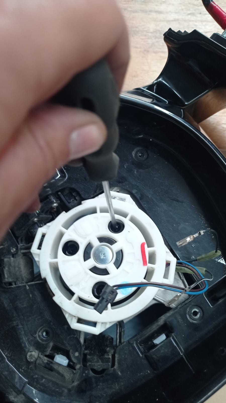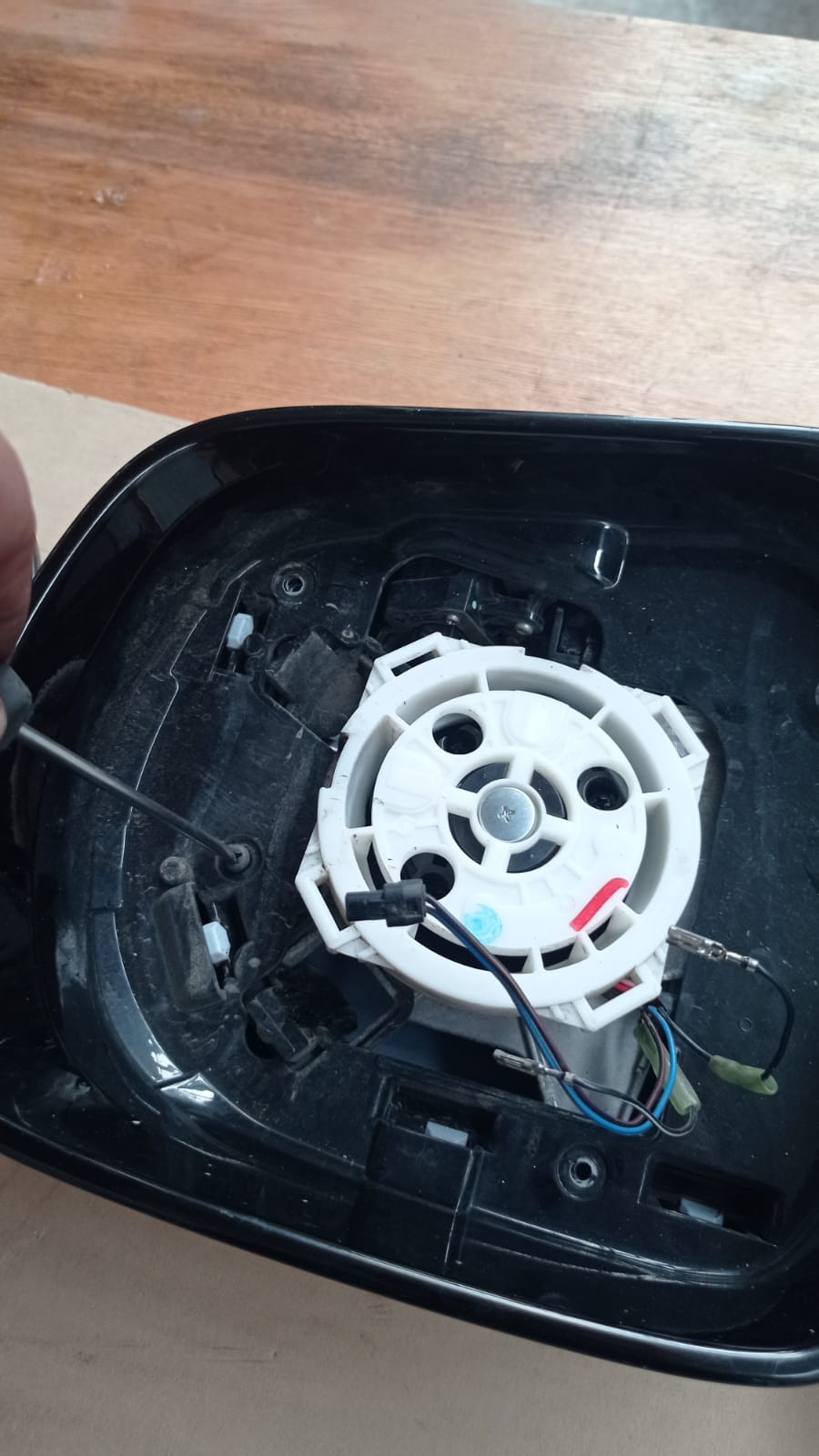 убираем элемент в сторону и откручиваеи три винта крепления электродвигателя регулирования зеркала и четыре винта по периметру как на фото ниже.