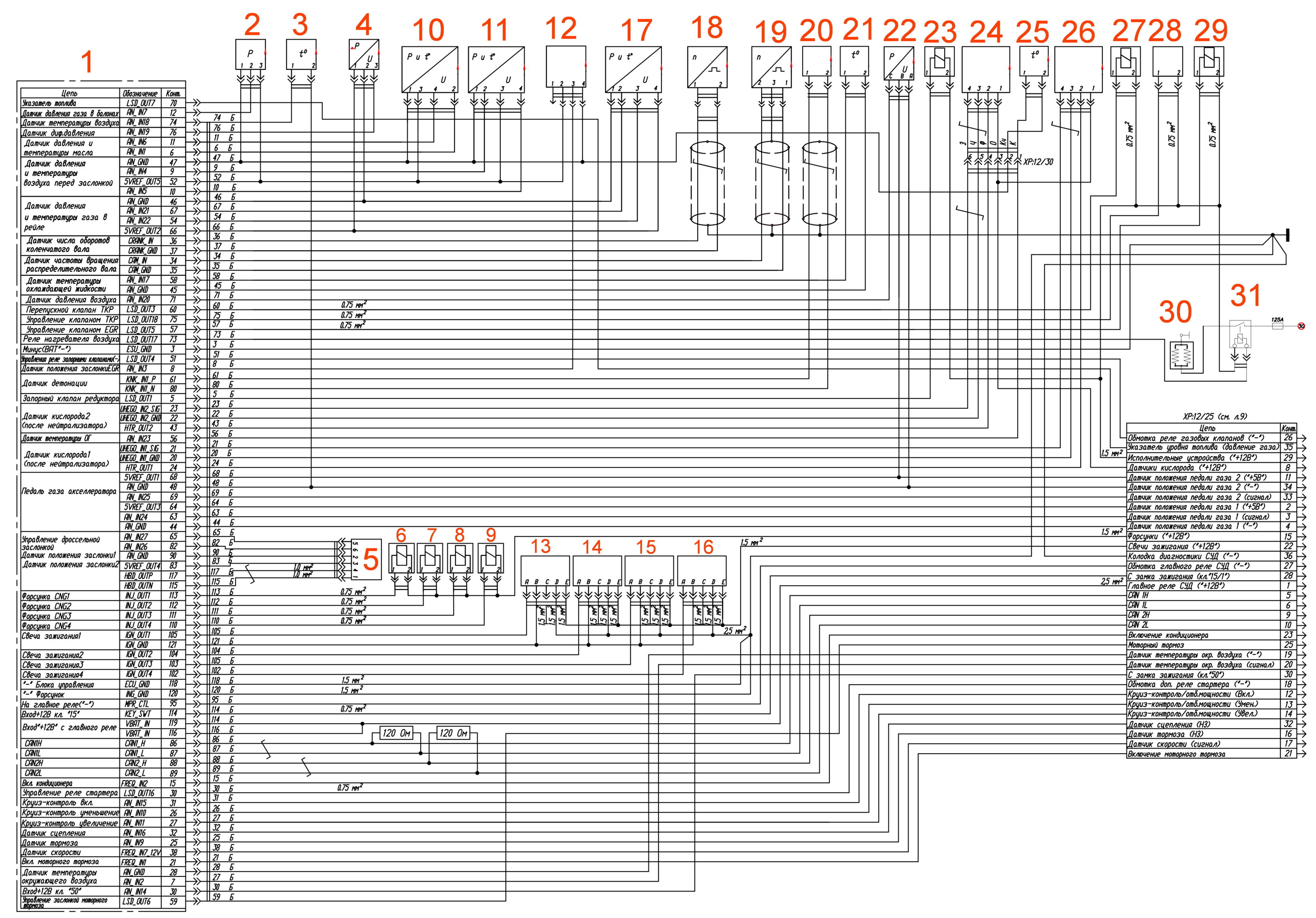 1 – блок управления двигателем; 2 – датчик давления газа в баллонах; 3 – датчик температуры воздуха; 4 – датчик дифференциального давления; 5 – дроссельная заслонка; 6 – форсунка CNG1; 7 – форсунка CNG2; 8 – форсунка CNG3; 9 – форсунка CNG4; 10 – датчик давления и температуры масла; 11 – датчик давления и температуры воздуха перед заслонкой; 12 – датчик положения заслонки рециркуляции; 13 – свеча зажигания 1; 14 – свеча зажигания 2; 15 – свеча зажигания 3; 16 – свеча зажигания 4; 17– датчик давления и температуры газа в рейле; 18 – датчик числа оборотов коленчатого вала; 19 – датчик числа оборотов распределительного вала; 20 – датчик детонации; 21 – датчик температуры охлаждающей жидкости; 22 – датчик давления воздуха; 23 – запорный клапан редуктора; 24 – датчик кислорода 2; 25 – датчик температуры ОГ; 26 – датчик кислорода 1; 27 – перепускной клапан ТКР; 28 – клапан ТКР; 29 – клапан рециркуляции; 30 – нагреватель воздуха 1.6 кВт; 31 – реле нагревателя воздуха; ХР:12/25 – колодка соединения жгута 12 (по двигателю) со жгутом 25 (по кабине); ХР:12/30 – колодка соединения жгута 12 (по двигателю) со жгутом 30 (по раме).
