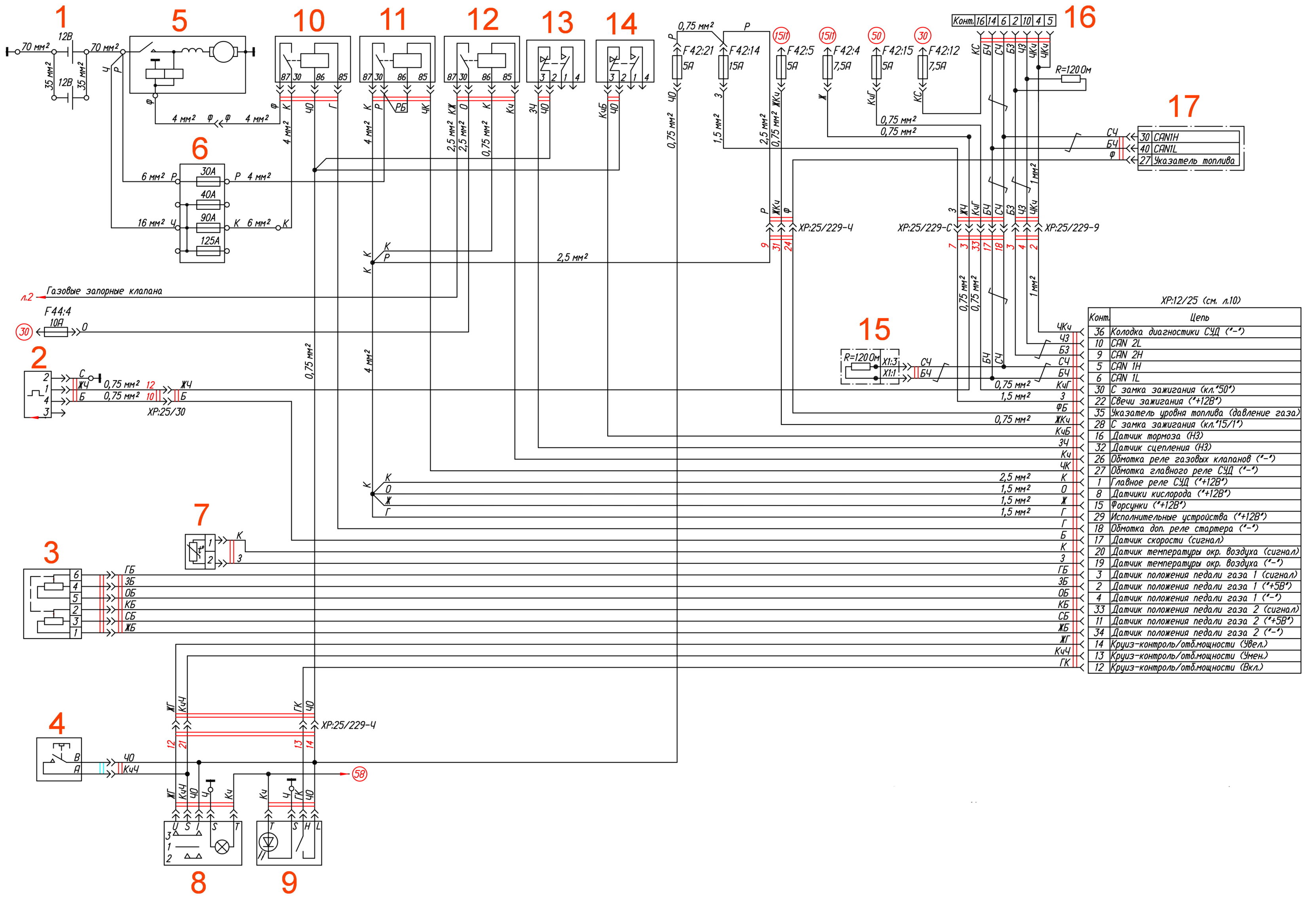 1 – аккумуляторные батареи; 2 – датчик скорости; 3 – датчик педали газа; 4 – кнопка (уменьшение) «Круиз-контроль»/«Отбор мощности»; 5 – стартер; 6 – блок предохранителей силовой; 7 – датчик температуры окружающего воздуха; 8 – переключатель «Круиз-контроль»/«Отбор мощности»; 9 – клавиша включения «Круиз-контроль»/«Отбор мощности»; 10 – дополнительное реле стартера; 11 – главное реле СУД; 12 – реле газовых клапанов; 13 – датчик сцепления; 14 – датчик торможения; 15 – блок управления АБС»; 16 – колодка диагностики; 17 – комбинация приборов; ХР:12/25 – колодка соединения жгута 12 (по двигателю) со жгутом 25 (по кабине); ХР:25/229-С – колодка соединения жгута 25 (по кабине) со жгутом 229 (по панели) серого цвета; ХР:25/229-Ч – колодка соединения жгута 25 (по кабине) со жгутом 229 (по панели) чёрного цвета; ХР:25/229-9 – колодка соединения жгута 25 (по кабине) со жгутом 229 (по панели) 9-ти контактная; ; ХР:25/30 – колодка соединения жгута 25 (по кабине) со жгутом 30 (по раме).