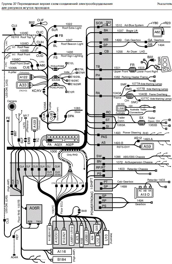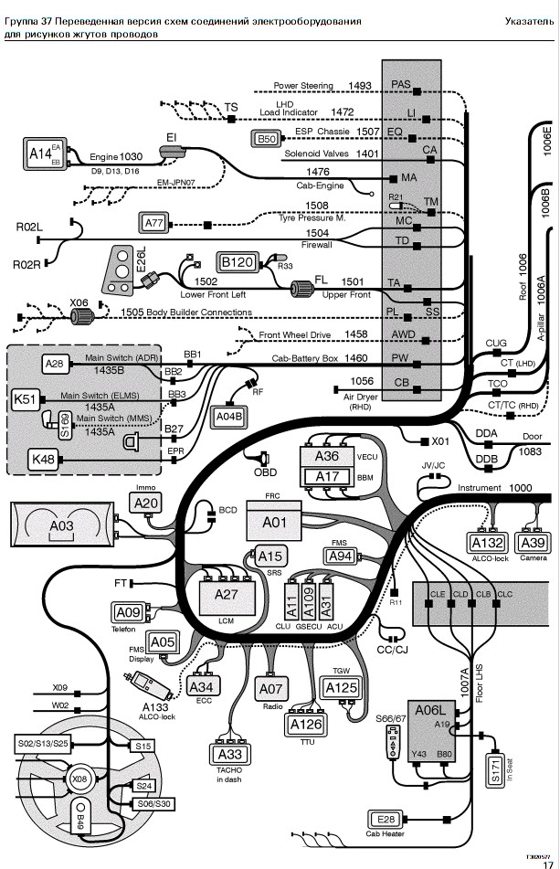 Указатель для рисунков жгутов проводов1000 Жгут проводов, приборы1006 Жгут проводов, крыша1007 Жгут проводов, пол1018 Жгут проводов, система кондиционирования воздуха1030 Жгут проводов, двигатель1037 Жгут проводов, подъемник тележки1040 Жгут проводов, рама1047 Жгут проводов, сигнальный маячок на крыше1056 Жгут проводов, влагоотделитель воздуха1062 Жгут проводов, стояночный отопитель, рама1063 Жгут проводов, соединения с прицепом1072 Жгут проводов, шасси с пневматической подвеской1077 Жгут проводов, задние габаритные фонари1083 Жгут проводов, дверь1086 Жгут проводов, ABS шасси1401 Жгут проводов, электромагнитные клапаны1403 Жгут проводов, замедлитель1435 Жгут проводов, главный выключатель бортового электропитания1436 Жгут проводов, светящийся знак на крыше1458 Жгут проводов, привод передних колес1460 Жгут проводов, кабина-аккумуляторный ящик1470 Жгут проводов, электроуправляемый кронштейн зеркала1472 Жгут проводов, индикатор нагрузки1476 Жгут проводов, двигатель-кабина1493 Жгут проводов, усилитель руля1494 Жгут проводов, коробка передач1499 Жгут проводов, кабина-коробка передач1501 Жгут проводов, передний верхний1502 Жгут проводов, нижний левый передний1503 Жгут проводов, нижний правый передний1504 Жгут проводов, щит моторного отсека1505 Жгут проводов, соединения оборудования кузова1506 Жгут проводов, демонтируемый (сменный кузов)1507 Жгут проводов, ESP шасси1508 Жгут проводов, TPM1510 Жгут проводов, SCRУказатель для иллюстраций- Антенна- Провода аккумуляторных батарей- Интерфейс кабины/шасси- ECU в кабине- Выключатели1000 Жгут проводов, приборы1006 Жгут проводов, крыша1007 Жгут проводов, пол1018 Жгут проводов, система кондиционирования воздуха1030 Жгут проводов, двигатель1037 Жгут проводов, подъемник тележки1040 Жгут проводов, рама1047 Жгут проводов, сигнальный маячок на крыше1056 Жгут проводов, влагоотделитель воздуха1062 Жгут проводов, стояночный отопитель, рама1063 Жгут проводов, соединения с прицепом1072 Жгут проводов, шасси с пневматической подвеской1077 Жгут проводов, задние габаритные фонари1083 Жгут проводов, дверь1086 Жгут проводов, ABS шасси1401 Жгут проводов, электромагнитные клапаны1403 Жгут проводов, замедлитель1435 Жгут проводов, главный выключатель бортового электропитания1436 Жгут проводов, светящийся знак на крыше1458 Жгут проводов, привод передних колес1460 Жгут проводов, кабина-аккумуляторный ящик1470 Жгут проводов, электроуправляемый кронштейн зеркала1472 Жгут проводов, индикатор нагрузки1476 Жгут проводов, двигатель-кабина1493 Жгут проводов, усилитель руля1494 Жгут проводов, коробка передач1499 Жгут проводов, кабина-коробка передач1501 Жгут проводов, передний верхний1502 Жгут проводов, нижний левый передний1503 Жгут проводов, нижний правый передний1504 Жгут проводов, щит моторного отсека1505 Жгут проводов, соединения оборудования кузова1506 Жгут проводов, демонтируемый (сменный кузов)1507 Жгут проводов, ESP шасси1508 Жгут проводов, TPM1510 Жгут проводов, SCRПеречень компонентовA01 Блок реле и предохранителей (1000)A02L Блок предохранителей, 6 предохранителей (GB:0 D) (1000)A02P Блок предохранителей, 6–позиционный (ME:2 C/MF:1 B) (1000)A02X Блок предохранителей, 6–позиционный (ME:3 C/MF:3 B) (1000)A03 Комбинация приборов (BI:0 B/CP:2 D/ZA RHD:2 B) (1000)A04A Холодильник (IQ:3 C) (1007B)A04B Холодильник (IQ:3 C) (1460)A05 Дисплей, FMS (Система управления автопарком) (BU:3 D/IZ:0 D) (1000)A06L Электропривод сиденья (IA:2 B) (1007A)A06R Электропривод сиденья (IA:0 B) (1007B)A07 Радиоприемник (IU:0 B/IU RHD:0 C) (1000)A09 Телефон (IX:0 C) (1
