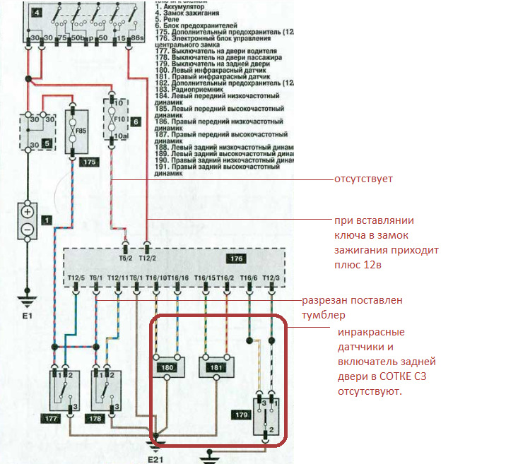 Исходя из схемы ниже отпирание или запирание любой из передних дверей приводит к изменению положения контактов переключателя на замках. На схеме эти переключатели обозначены под номерами: 177 и 178.